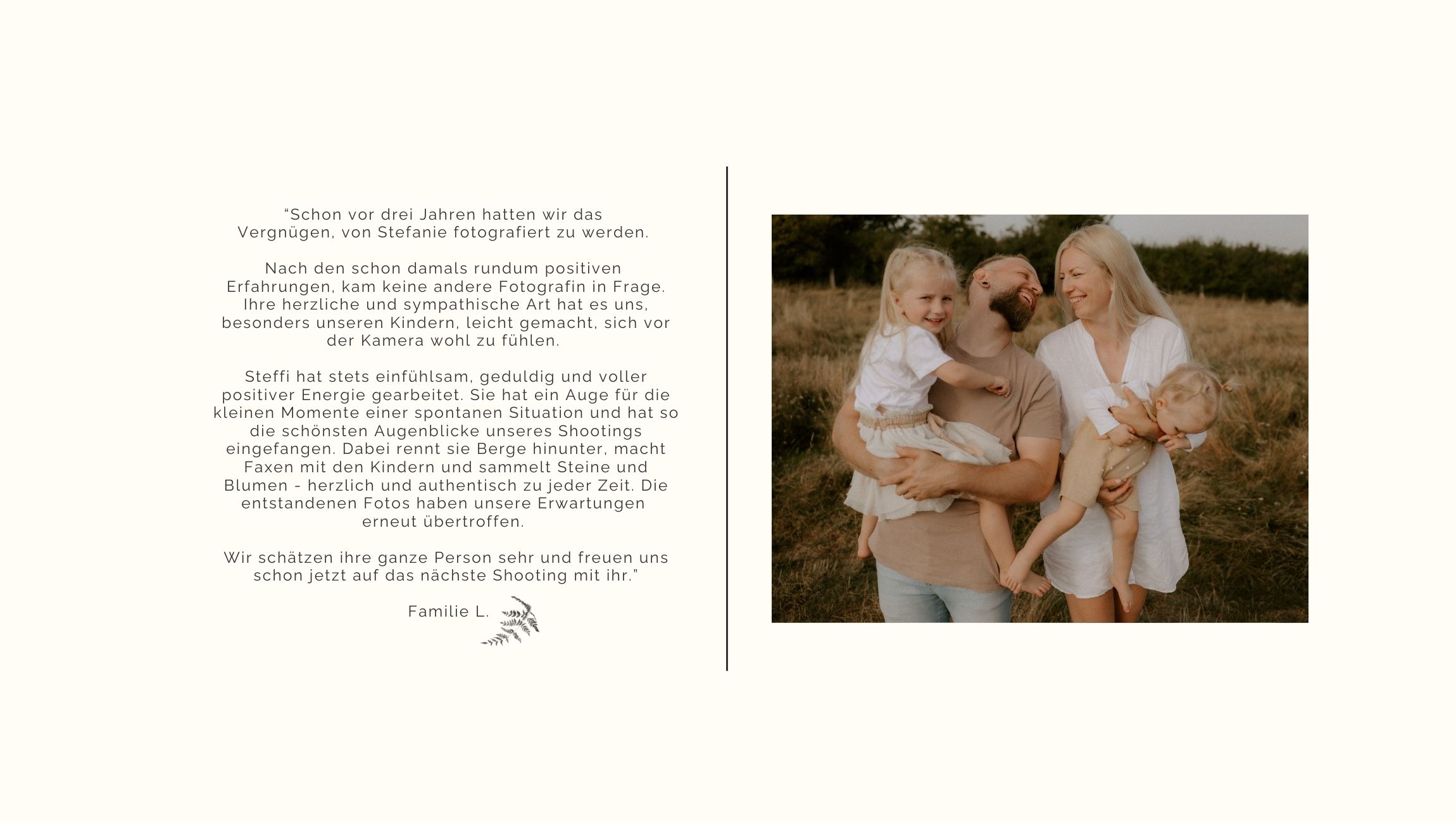 "Steffi hat stets einfühlsam, geduldig und voller positiver Energie gearbeitet. Sie hat ein Auge für die kleinen Momente einer spontanen Situation und hat so die schönsten Augenblicke unseres Shootings eingefangen. Dabei rennt sie Berge hinunter, macht Faxen mit den Kindern und sammelt Steine und Blumen - herzlich und authentisch zu jeder Zeit.